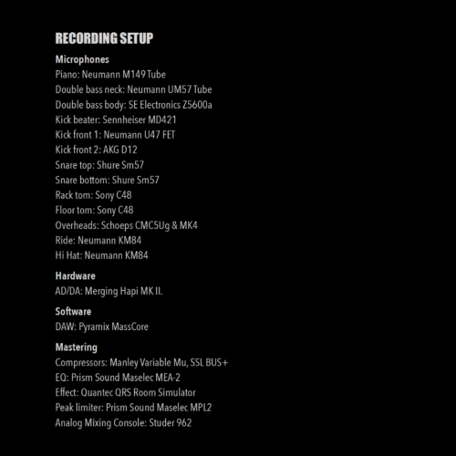 | Gear | "Microphones Piano: Neumann M149 Tube Double bass neck: Neumann UM57 Tube Double bass body: SE Electronics Z5600a Kick beater: Sennheiser MD421 Kick front 1: Neumann U47 FET Kick front 2: AKG D12 Snare top: Shure Sm57 Snare bottom: Shure Sm57 Rack tom: Sony C48 Floor tom: Sony C48 Overheads: Schoeps CMC5Ug & MK4 Ride: Neumann KM84 Hi Hat: Neumann KM84 Hardware AD/DA: Merging Hapi MK II. Software DAW: Pyramix MassCore Mastering Compressors: Manley Variable Mu, SSL BUS+ EQ: Prism Sound Maselec MEA-2 Effect: Quantec QRS Room Simulator Peak limiter: Prism Sound Maselec MPL2 Analog Mixing Console: Studer 96" |