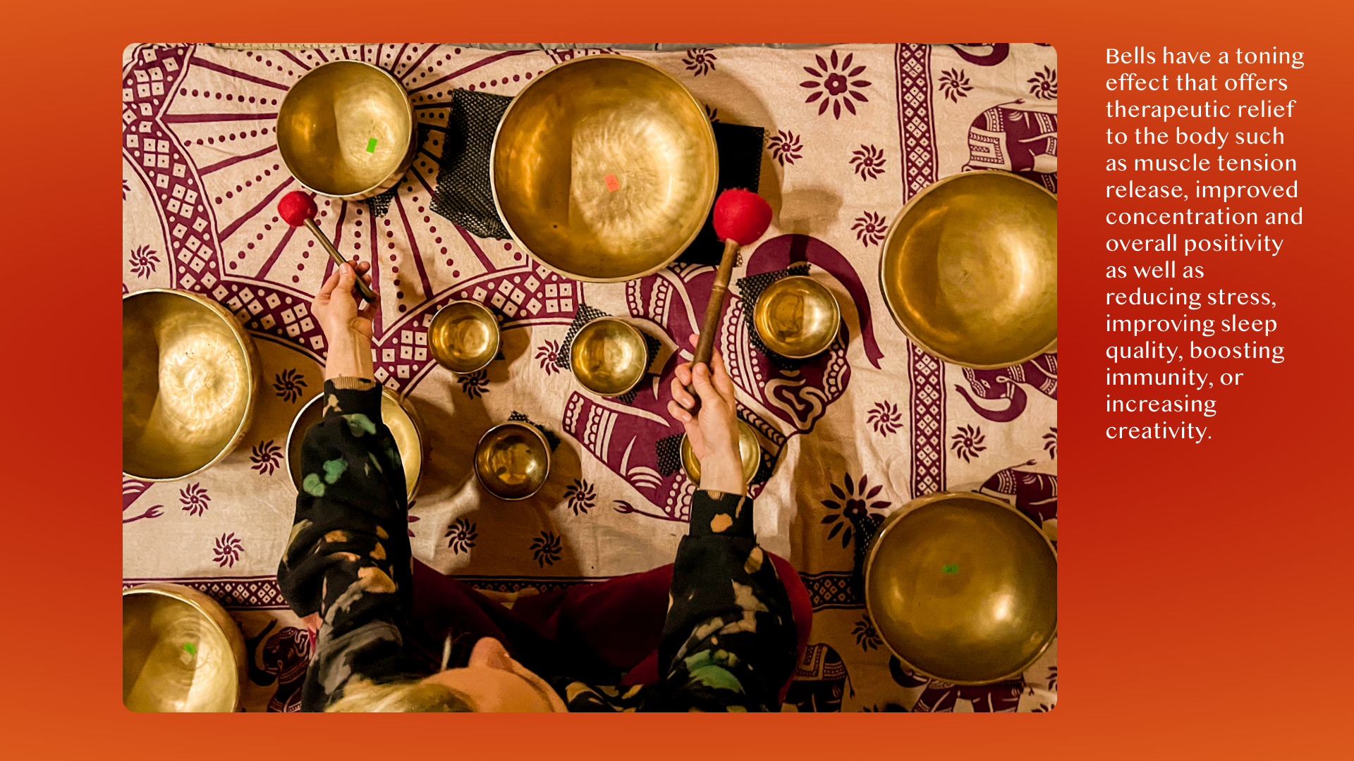 Bells have a toning effect that offers therapeutic relief to the body such as muscle tension release, improved concentration and overall positivity as well as reducing stress, improving sleep quality, boosting immunity, or increasing creativity. The Tibetan Brass Meditation Bells used in this recording are free standing bells. Ringing a Bell helps you change your mind state if you feel that your thoughts are drifting away from the present moment. Once you ring the bell, your mind becomes re-focused on the “now”.