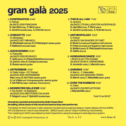 Gran Galà 2025 Audiophile Sampler is a reference album for audiophiles. It was featured at the most recent Gran Gala event that Fone has been organizing for almost 20 years in Italy. Events born to best promote this extraordinary world of music. The presentation took place on March 8 and 9, 2025 on the occasion of the Gran Galà dell’ Alta Fedeltà in Rome. It contains a collection of songs ranging from Jazz, Pop to Classical Music.