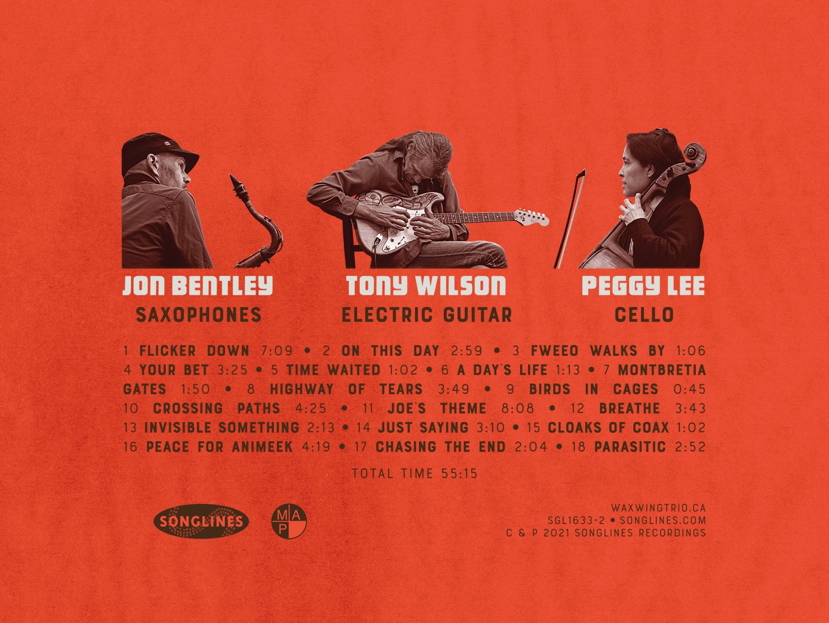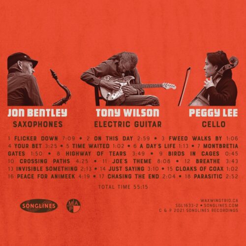 Vancouver-based Waxwing, a collaborative trio of Tony Wilson, electric guitar, Jon Bentley, saxophones, and Peggy Lee, cello, follow the chamber jazz tradition of dispensing with the conventional piano-bass-drums jazz rhythm section. Their unusual instrumentation places an emphasis on middle-register voices; Wilson often plays in the guitar’s middle range, strumming chords and plucking arpeggios, while Lee’s cello and Bentley’s tenor sax overlap the same register of orchestral pitches. This lends the trio a kind of timbral consistency that draws the listener’s attention more closely into the melodic and textural weave of the music.